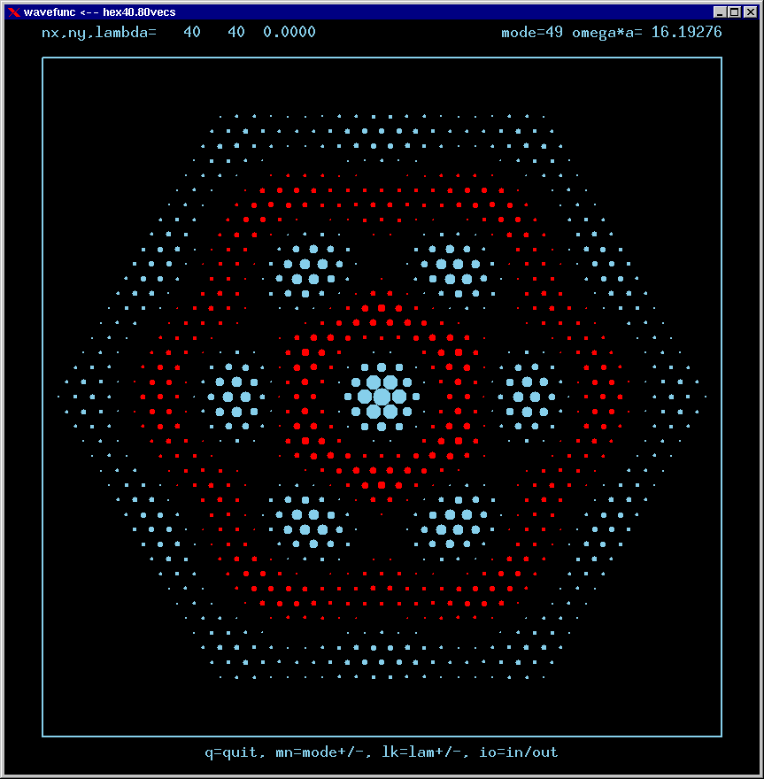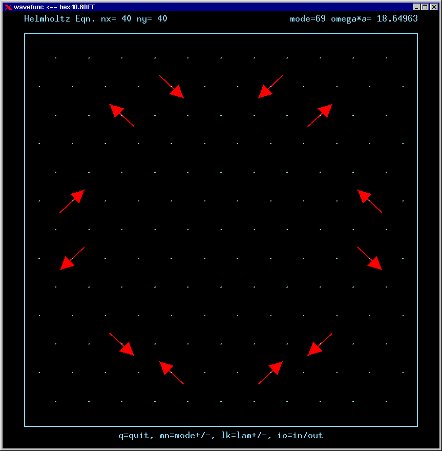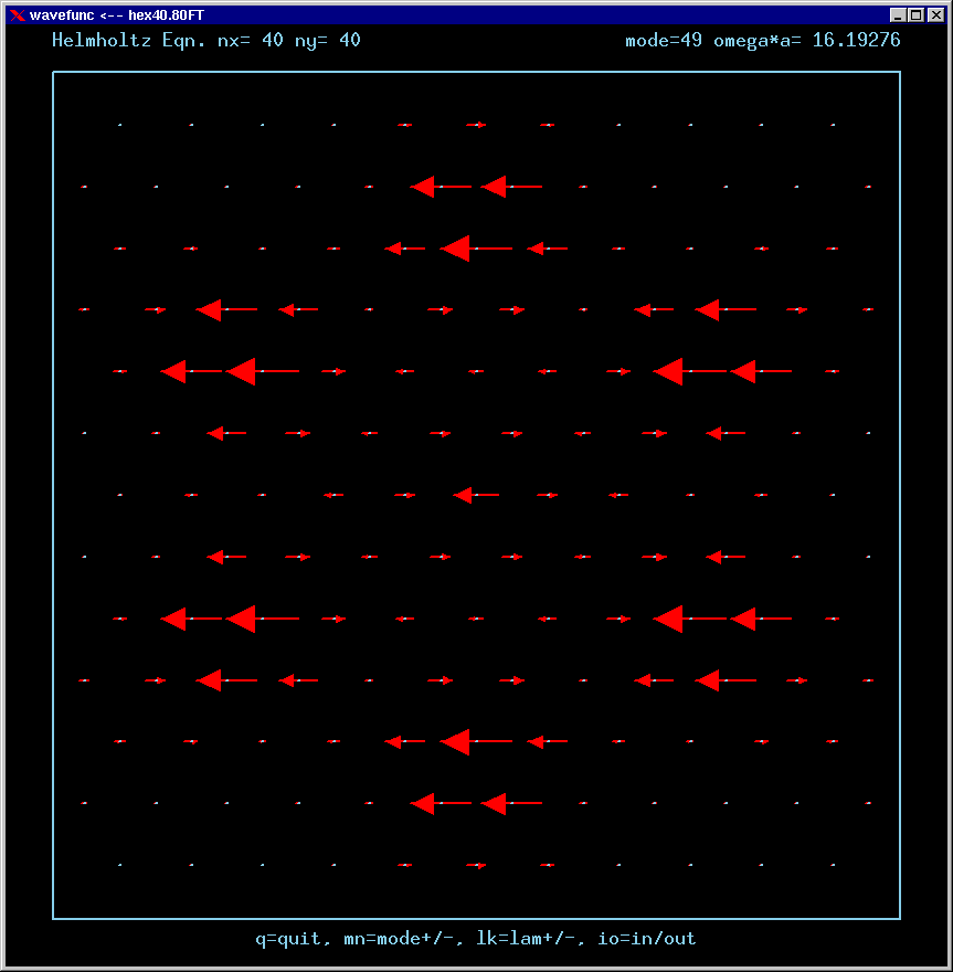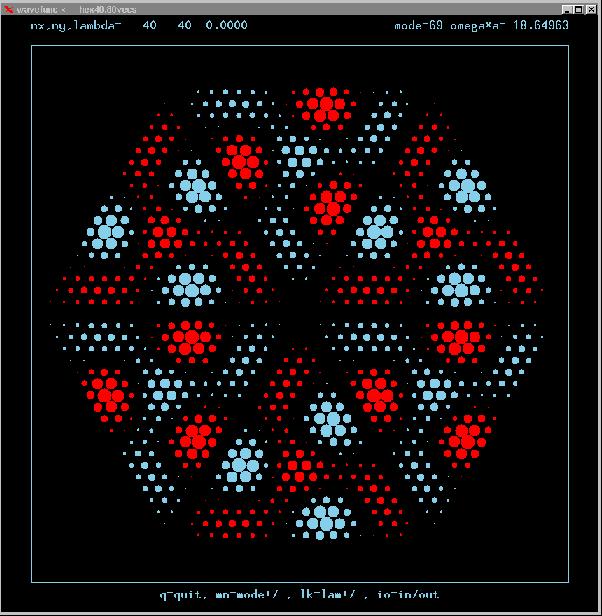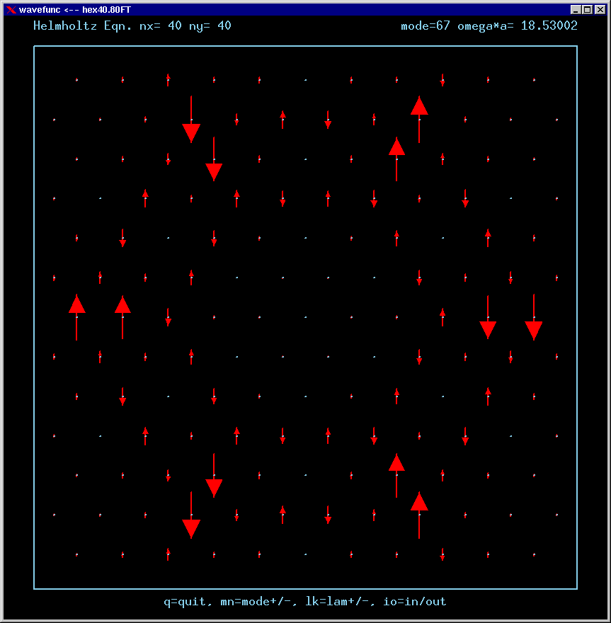 These are the real-valued wavefunctions and complex-valued Fourier Transforms of many of the lowest modes, obtained from a Gauss-Seidel numerical relaxation procedure. They are displayed on a grid for convenience; the wavefunction magnitude at each position is proportional to the symbol size there. Red is positive, blue is negative wavefunction value.
