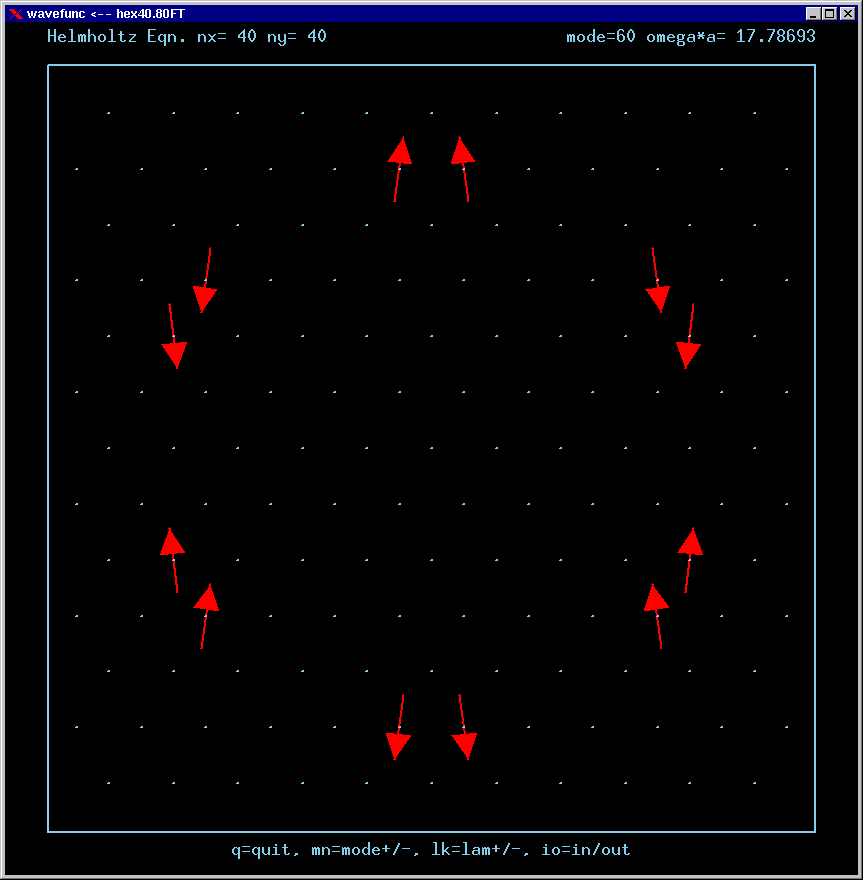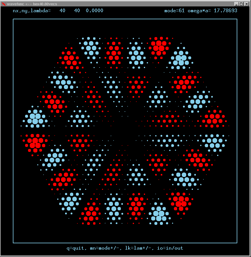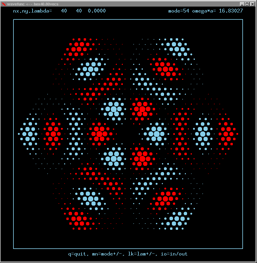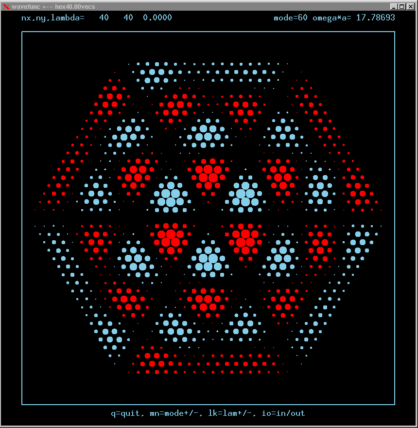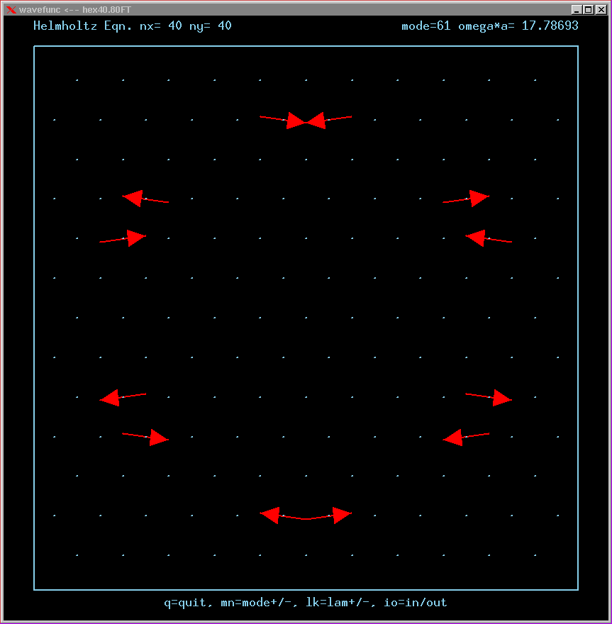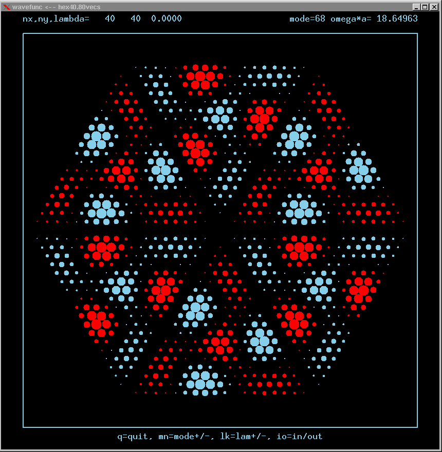 These are the real-valued wavefunctions and complex-valued Fourier Transforms of many of the lowest modes, obtained from a Gauss-Seidel numerical relaxation procedure. They are displayed on a grid for convenience; the wavefunction magnitude at each position is proportional to the symbol size there. Red is positive, blue is negative wavefunction value.